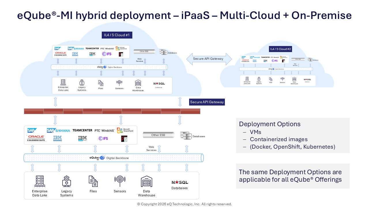The eQube® Data-as-a-Service (DaaS) Platform offers flexible deployment options to meet diverse enterprise needs. It can be deployed on the cloud, on-premise, or in a hybrid configuration combining both. In any cloud setup, it functions as an Integration Platform as a Service (iPaaS) for seamless connectivity across systems.
